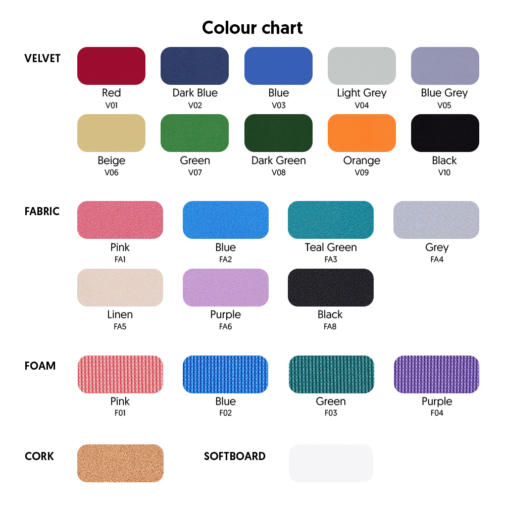 VELVET | FABRIC | FOAM | CORK | SOFT BOARD | COATED STEEL |